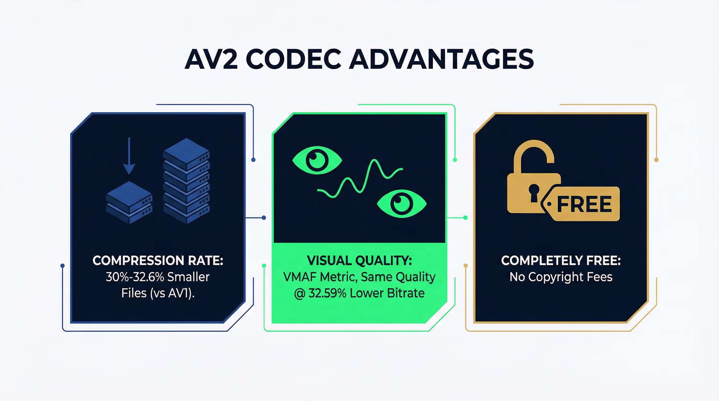 压缩率,在相同画质下,相比AV1,AV2能再砍掉30%-32.6%的体积